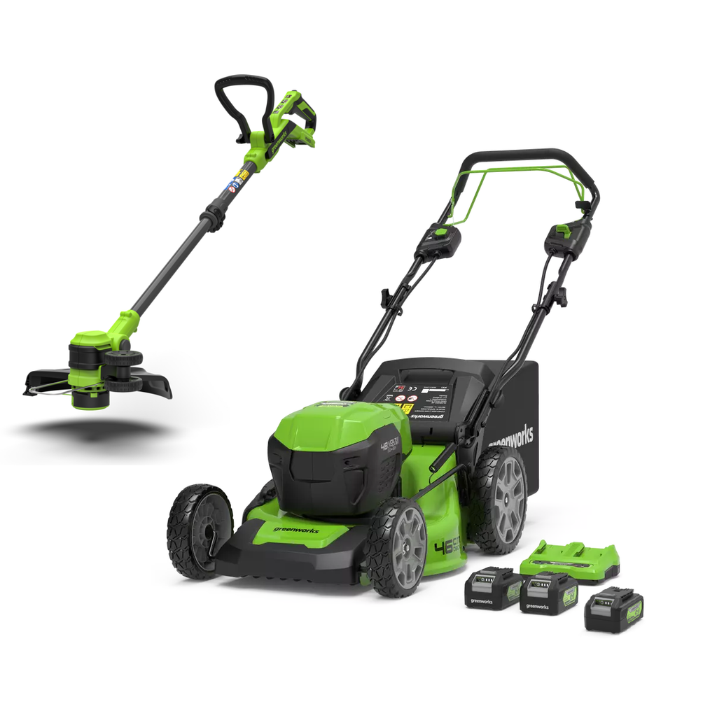 - Inhalt – 48V (24V x 2) Rasenmäher, 24V Rasentrimmer Gen. II , 3x 4Ah Akkus, Ladegerät